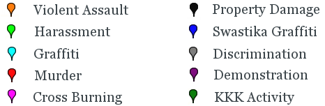 The interactive map of bias-motivated incidents below sorts incidebts by type of incident. The markers are color coded by type; a key is provided below the map. Checking the boxes to the right of the map will turn that specific type on or off. All are "on" by default. Use the scale on the left to enlarge the map. Click on any incident to get a brief description. For most incidents originally reported in the Northwest Indiana Times and for some reported in the Post-Tribune, a link to the original newspaper report is provided.